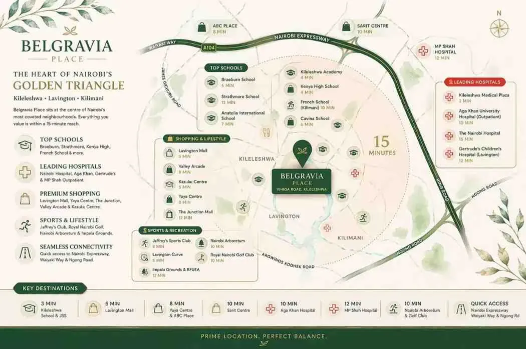 Location : located in the middle section of Vihiga Road in Kililashiwa, very close to Lavington. The surrounding environment is quiet, green, and highly livable. One standout feature is the presence of several of the largest and most beautiful mature trees along the road right at the project entrance, which can even be clearly seen on Google—giving the project a strong identity and natural charm.