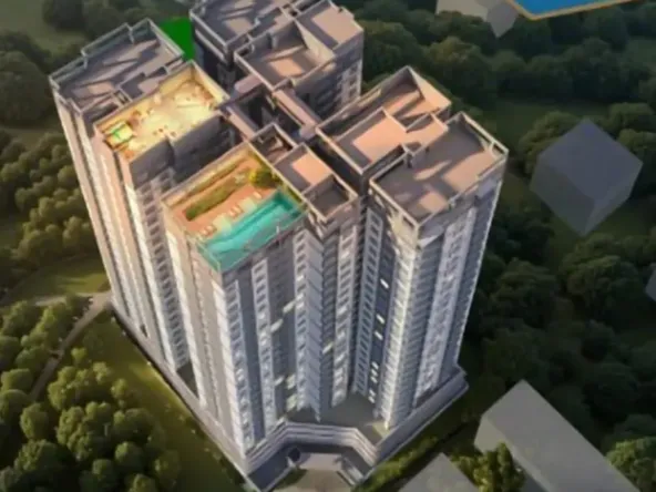 Key features include a heated rooftop pool, green spaces, and high-speed lifts.